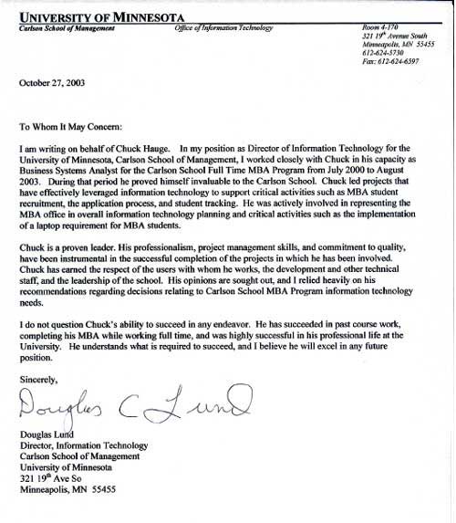 In my position as Director of Information Technology for the University of Minnesota, Carlson School of Management, I worked closely with Chuck in his capacity as Business Systems Analyst for the Carlson School Full Time MBA Program. During that period he proved himself invaluable to the Carlson School. Chuck led projects that have effectively leveraged information technology to support critical activities such as MBA student recruitment, the application process, and student tracking. He was actively involved in overall information technology planning and critical activities such as the implementation of a laptop requirement for MBA students. Chuck is a proven leader. His professionalism, project management skills, and commitment to quality, have been instrumental in the successful completion of the projects in which he has been involved. Chuck has earned the respect of the users with whom he works, the development and other technical staff, and the leadership oft he school. His opinions are sought out, and I relied heavily on his recommendations regarding decisions relating to Carlson School MBA Program information technology needs. He understands what is required to succeed. Douglas C. Lund, Director, Information Technology |