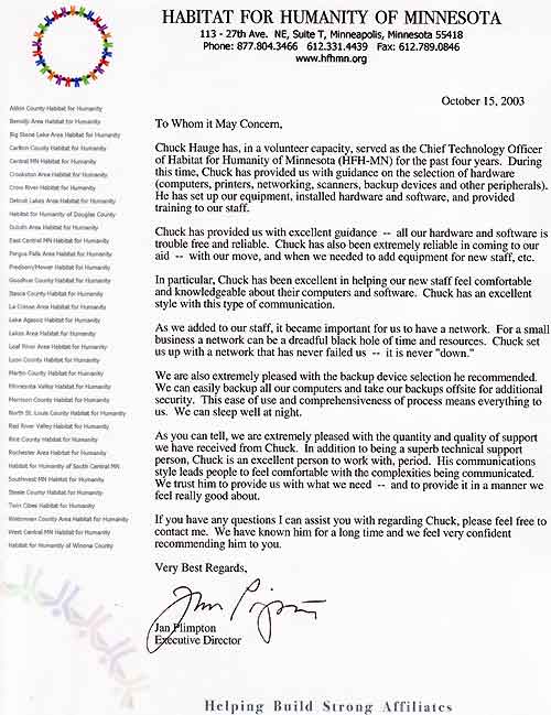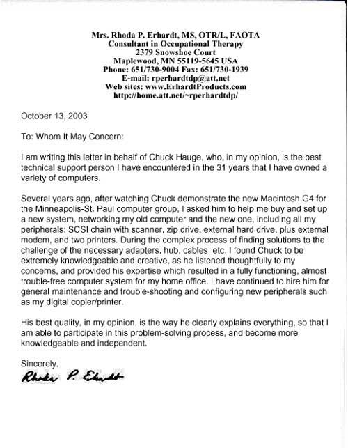 In my opinion Chuck Hauge, who is the best technical support person I have encountered in the 31 years that I have owned a variety of computers. I asked Chuck to help me buy and set up a new system, networking my old computer and the new one, including all my peripherals. During the complex process of finding solutions to the challenge of the necessary adapters, hub, cables, etc. I found Chuck to be extremely knowledgeable and creative, as he listened thoughtfully to my concerns, and provided his expertise which resulted in a fully functioning, virtually trouble-free computer system for my home office. His best quality, in my opinion, is the way he clearly explains everything, so that I am able to participate in this problem-solving process, and become more knowledgeable and independent. Sincerely, Rhoda P. Erhardt, MS, OTR/L, FAOTA |